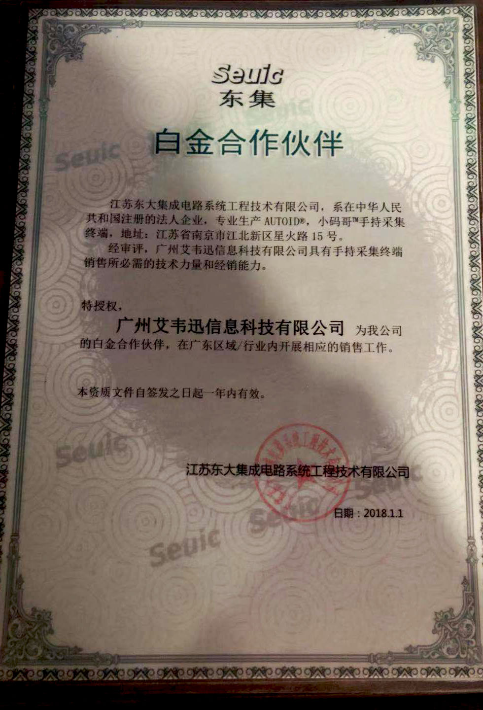 廣州艾韋迅信息科技有限公司于2018年1月接到江蘇東大集成電路系統(tǒng)工程技術(shù)有限公司通知,授予公司2018年度白金業(yè)務(wù)合作伙伴證書。